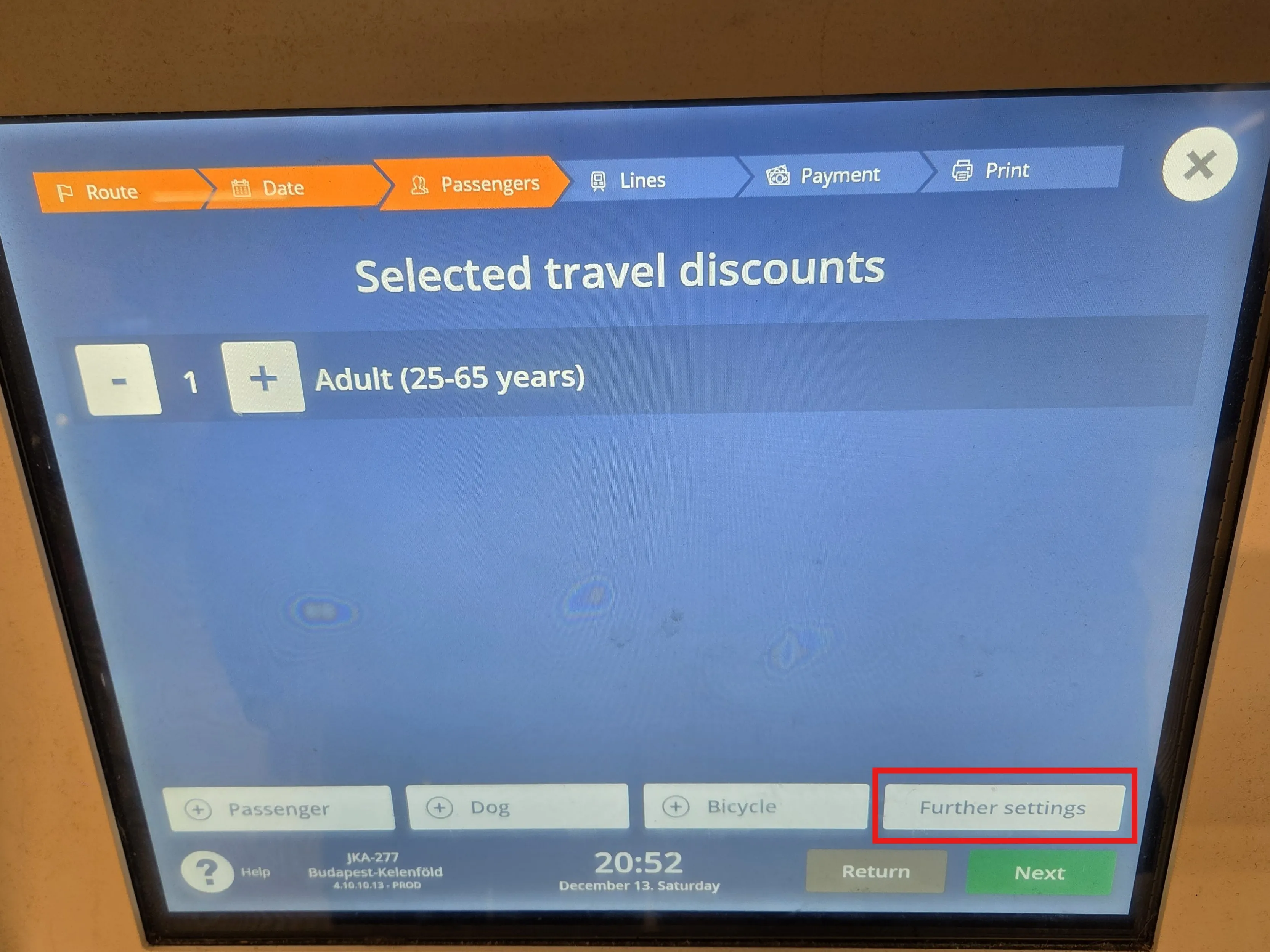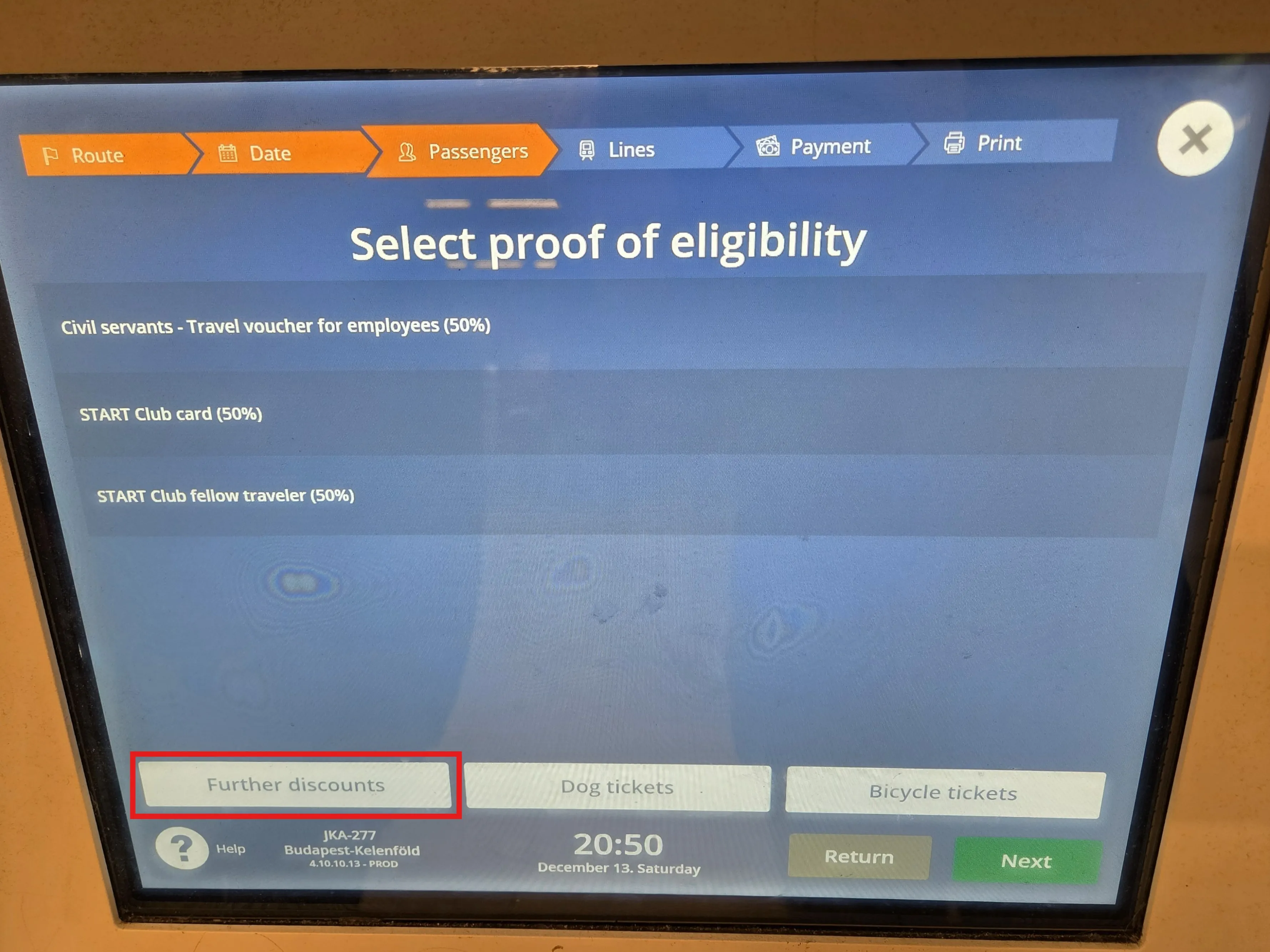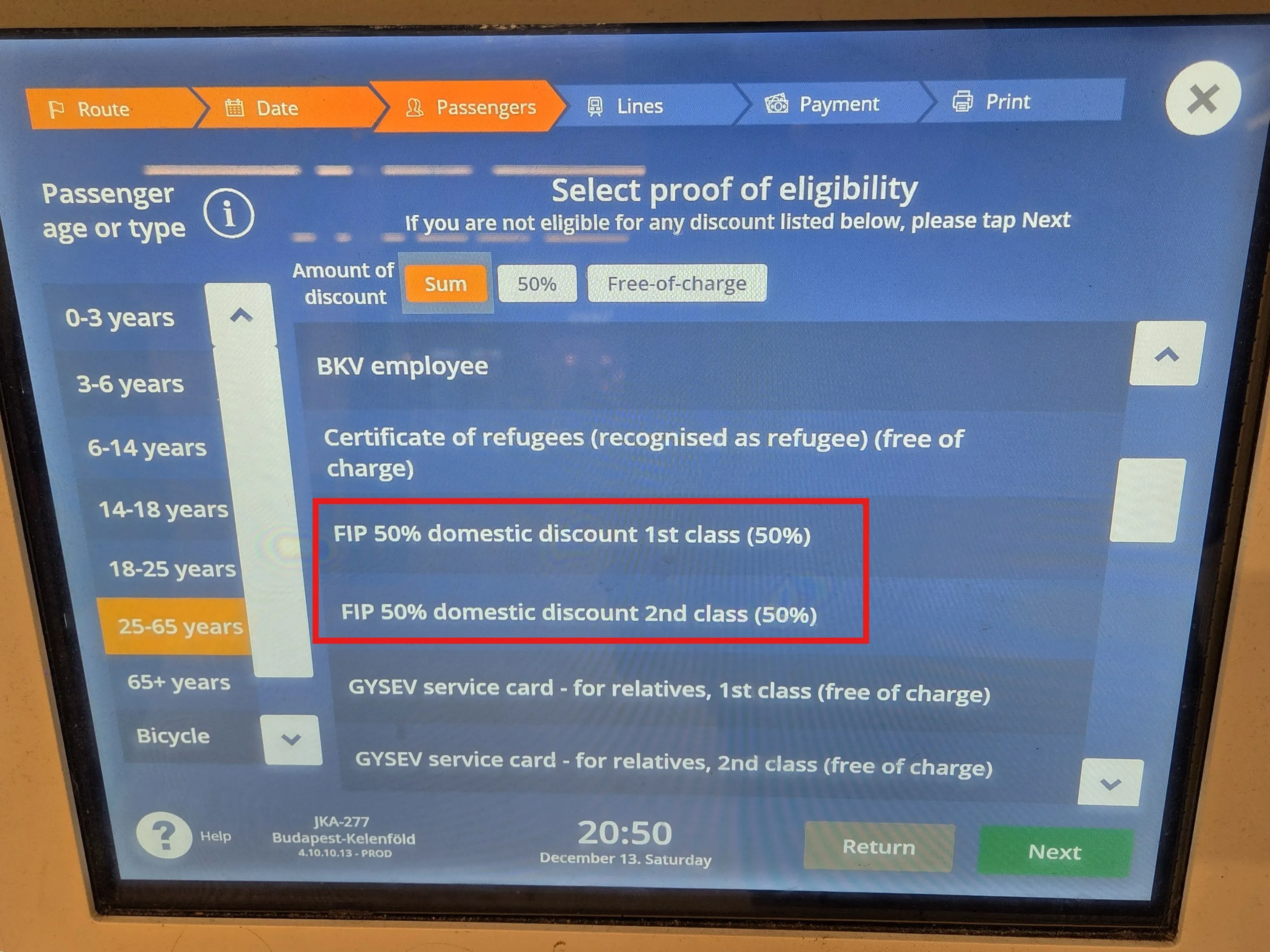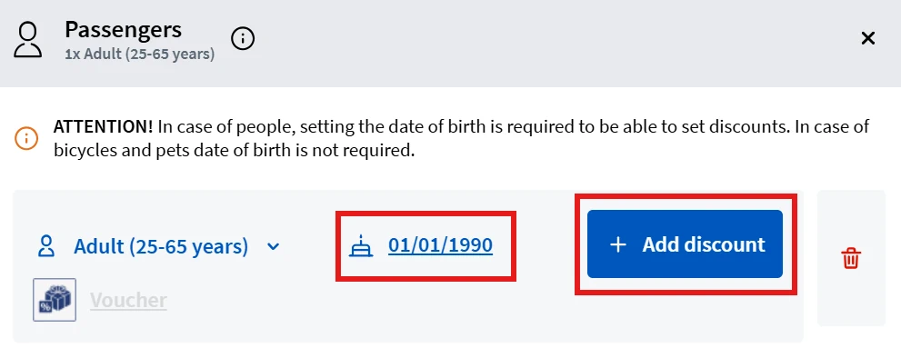 FIP 50 Tickets for MÁV and GySEV connections are sold on the MÁV booking website. To add the FIP 50 discount, on the connection search page under Passengers and Discounts, the passenger overview must be opened. Only after entering the date of birth can the FIP 50 discount be added with Add Discounts. A distinction is made between FIP 50 1st class and 2nd class. The class refers to the eligibility, not the desired class of the ticket.